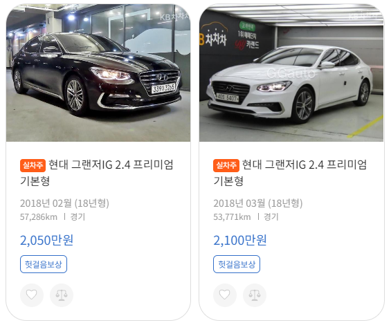 그러나 주의해야 할 부분은 이 가격은 판매 가격이므로 매입 가격과 차이가 날 수 있다는 것입니다. 예를 들어, 현대 그랜저 IG 2.4 프리미엄의 2018년 2-3월 차량을 살펴보면, 만약 내 차량이 55,000km 정도를 주행하고 연식이 동일하다면, 약 2,100만원 내외로 가격이 형성될 것입니다. 이 가격에서 200만원 정도를 더 내리면 내 차량의 중고 판매 가격을 대략적으로 예측할 수 있습니다. (아래그림 참조)