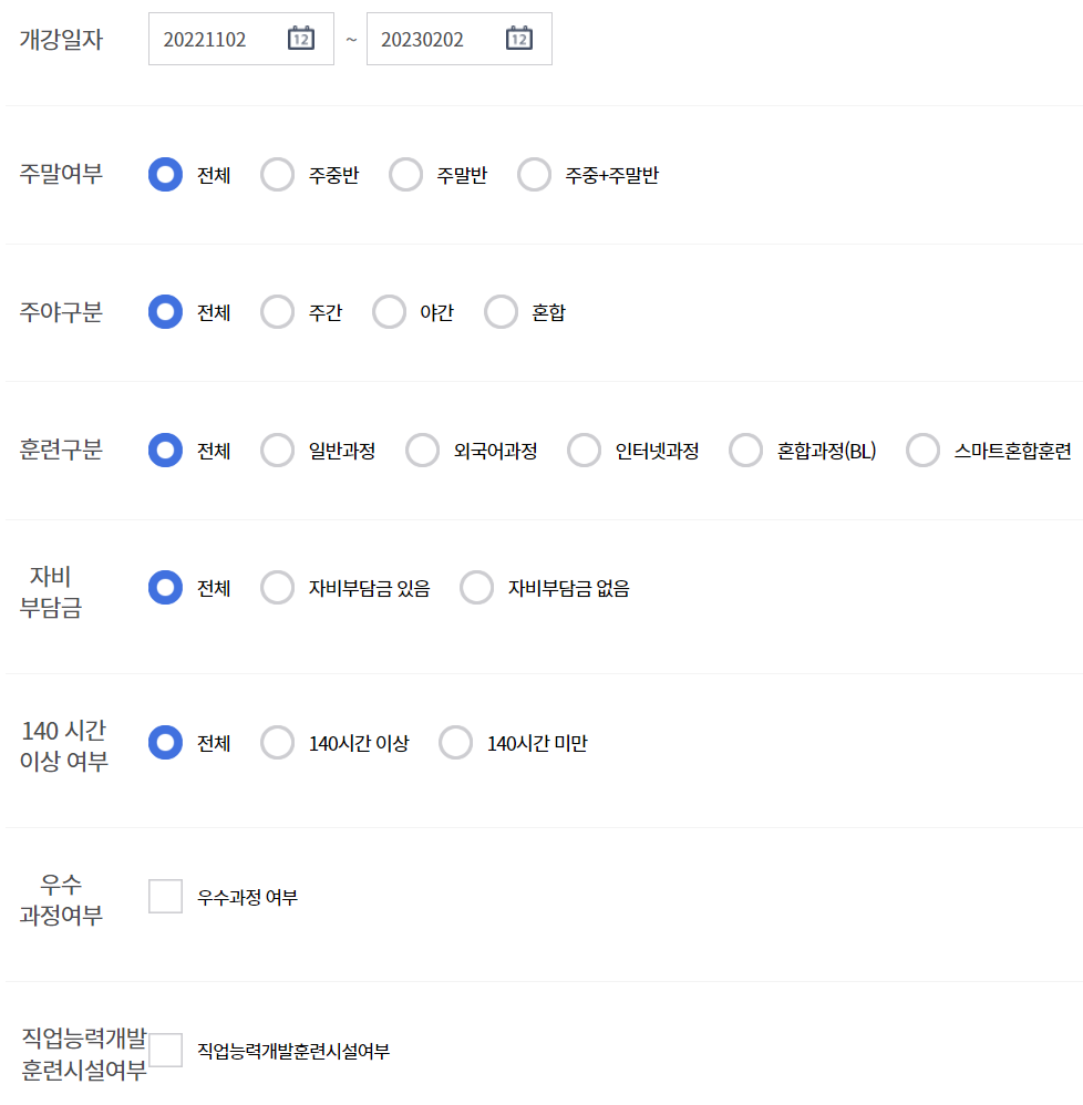 강의 기간, 온라인/오프라인 수업, 자비 부담금 여부 등의 구분으로 상세한 검색이 가능합니다.