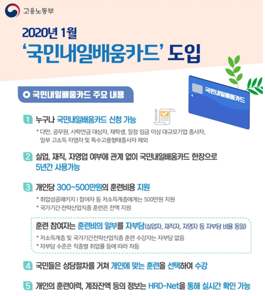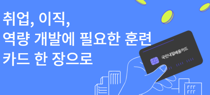 처음 들어보셨나요? 국민내일배움카드는 고용노동부의 직업 능력 개발 사업의 일환으로 실업·재직·자영업 여부에 관계없이 직업능력개발훈련을 위한 교육비(훈련비)를 지원해주는 카드입니다.