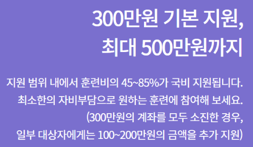 내일배움카드 신청자격이 있는 분들에게는 5년간 1인당 300만원까지 지원하며 일부 추가 지원 대상자에게는 100~200만원의 금액을 추가지원합니다. 이는 교육비(훈련비)의 45%~85%를 지원하는 것입니다. 교육을 희망하는 자가 국민취업지원제도 I , II유형에 해당하면 100% 지원을 받을 수도 있다고 하네요.