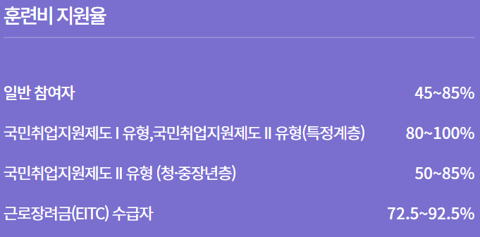 훈련비의 지원율은 지원 대상에 따라 차등적용되는 부분입니다. 국민취업지원제도 I유형, 국민취업지원제도 II유형(특정계층)은 100%의 지원금을 받기도 하지만 일반 지원자는 최대 85%까지의 지원비만 받을 수 있습니다. 100%가 아니라 아쉽다고 생각하실 수도 있지만 대부분의 교육이 직업능력을 기르기 위한 전문적인 교육 과정임을 고려하면 수강료가 높은 편이기 때문에 내일배움카드를 통해 국비지원금을 받을 수 있는 것은 상당한 이점이 있습니다.