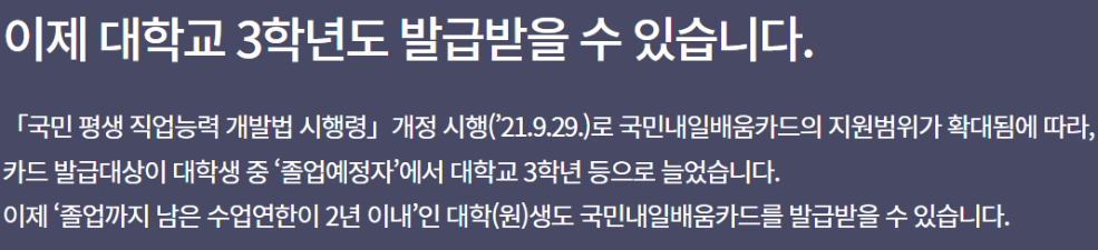 아무래도 직업능력 개발을 위한 지원비인 만큼 졸업을 앞두지 않은 학생들은 제외되는 것 같네요. 또한 임금 300만원을 기준으로 신청 자격을 제한하고 있는 것으로 보아 지원이 더욱 절실한 계층을 주력으로 도와주기 위한 것인 것 같습니다. 다만 임금이 300만원이 높고 대규모 기업 종사자라고 하더라고 45세가 넘어서면 내일배움카드 신청자격이 있으니 이 점은 꽤 합리적인 것 같습니다.