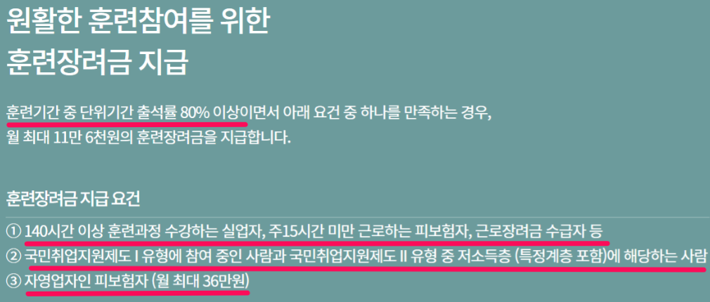 총 140시간 이상 장기로 훈련 과정을 수강하는 실업자, 저소득 재직자 등은 출석률이 80%이상 달성한다면 월 최대 116,000원을 훈련 장려금으로 지급한다고 합니다.