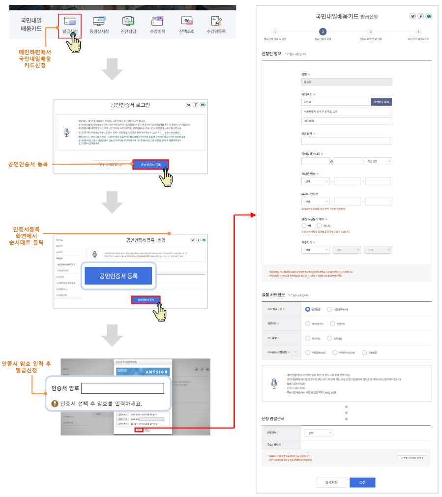 HRD-Net을 통해 국민내일배움카드를 신청하실 때는 발급신청을 위해 공인인증서 등록과 로그인을 하셔야 하는데 간혹 이 과정을 어려워 하시는 분들도 계시더군요. 20-30대에게는 아무렇지도 않은 과정이지만, 이 부분이 부담스럽다면 고용센터 방문을 통해 신청해주시면 가능합니다.