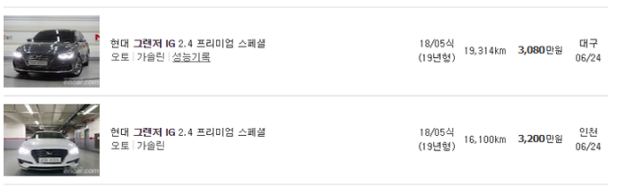 위의 그림은 그랜저 IG 2.4 모델이고, 2018년 5월 연식의 가격표입니다. 만약 내차가 18,000km 내외로 주행 했다고 예를 들어보면, 내차의 가격은 3,100만원 정도에서 팔릴 수 있겠구나라고 생각하면 됩니다. 이 가격에서 200만원 정도 낮추면, 중고팔때 내차의 대략적인 가격이 계산되어 집니다.
