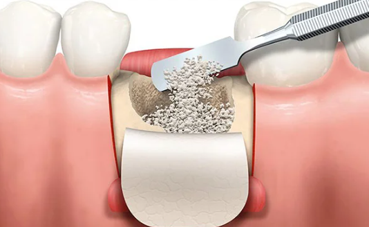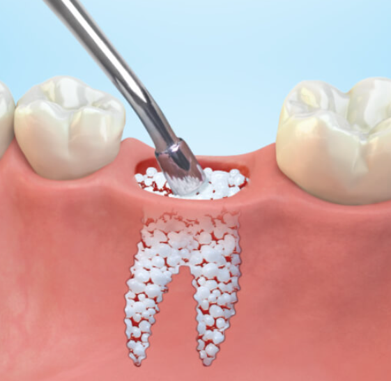 임플란트 뼈이식: 채취한 뼈나 선택한 뼈재료를 손실된 부분에 이식합니다.