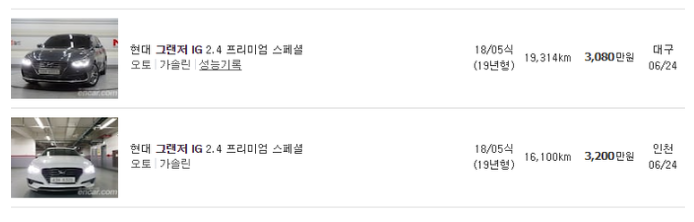 위 그림은 그랜저 IG 2.4의 2018년 5월의 차량입니다. 내 차가 만약 18,000 km 정도 주행을 했다고 가정한다면, 약 3,100만원 정도에서 가격이 형성되겠구나 라고 생각을 해볼 수 있습니다. 여기에서 200만원 정도를 빼주면, 내차의 중고팔때 대략적인 가격이 산출됩니다.