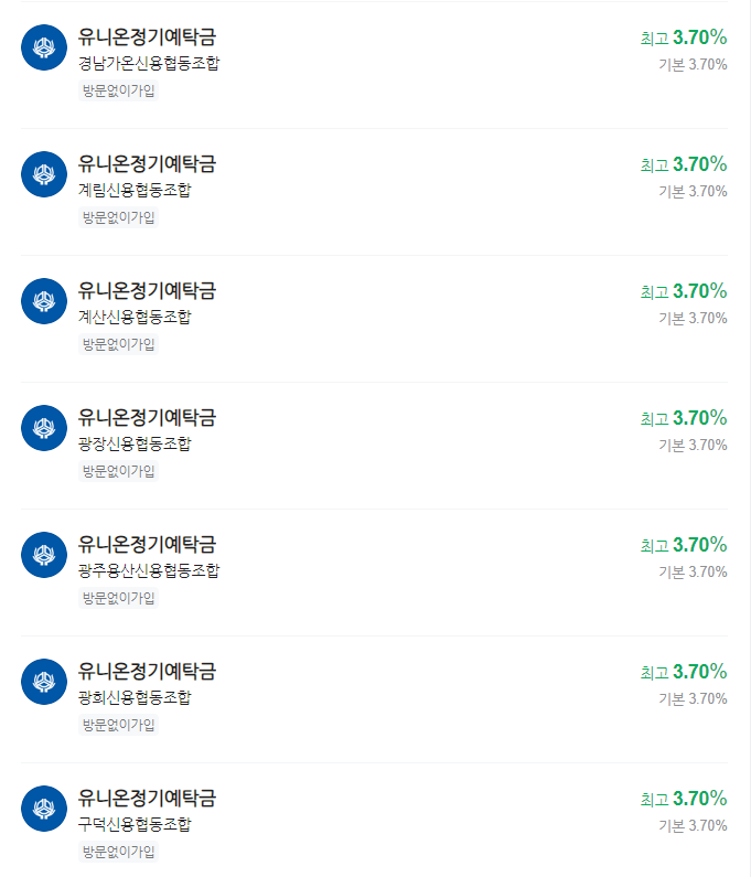 - 익산신협과 경남가온신협, 그리고 계림신협은 모두 연 3.70%~3.71%의 고금리를 제공하며, 모바일로 간편하게 가입할 수 있어 접근성이 뛰어납니다.