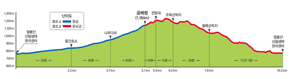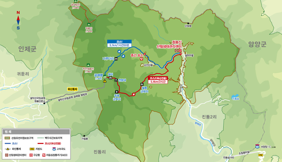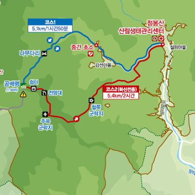 A. 코스 1: 점봉산 산림생태관리센터 → 곰배령 정상